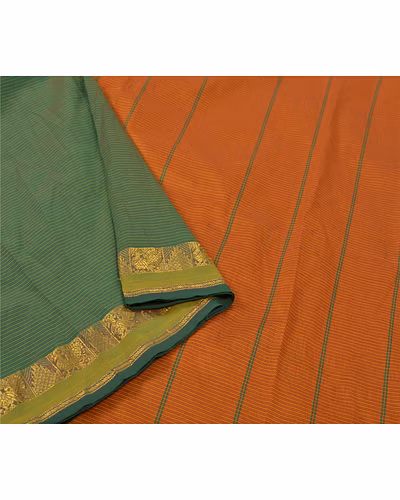 Beautiful Green & Orange Colored Blend Cotton Woven Sari. Features Of The This Sari Orange/Green Woven Work On Pallu & Center Part Of Sari. You Can See Golden Zari Woven Work With Peacock Design On Borders. Brown Fringes On Pallu. What Is Special About This Saree? Main Attraction Of This Sari Is Shining Golden Border With Lovely Peacock Pattern Is Really Enhancing The Beauty Of The Charm.